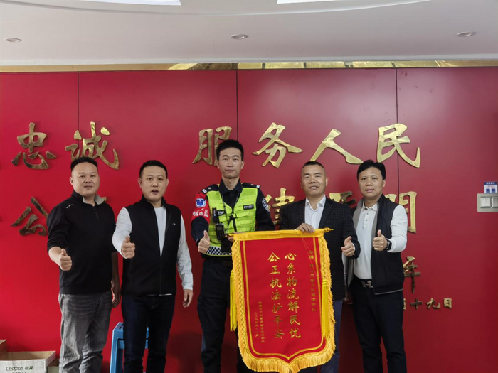 2025 年 12 月 5 日,深圳市平江商会监事长、物流运输行业协会会长单卫国,物流运输协会(西部)会长、南山公路运输民兵连连长兼党支部书记喻灿明,协会(西部)执行会长张水兵、秘书长黄杰一行,专程走访南山区交警大队前海中队,将印着 “心系物流解民忧,公正执法护平安” 的锦旗送到副中队长吴志勇手中,致谢交警部门护航物流安全、助力行业发展。