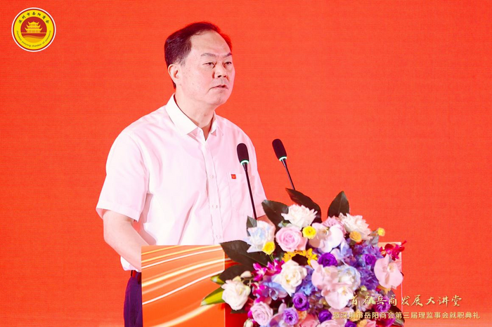 岳阳市商务局局长陈立新对岳阳市市情及政策进行推介。他指出,岳阳作为一座历史文化名城,正在积极构建以“1+3+X”为核心的现代化产业体系:持续推动传统产业转型升级,巩固提升港口物流、现代农业与绿色食品加工、文体旅游等支柱产业;大力发展先进装备制造、循环经济、医药健康等新兴产业;并前瞻布局生物制造、氢能等未来产业。陈立新强调,岳阳始终坚持生态优先、绿色发展,积极融入全国统一大市场,持续推进改革创新。最后,他诚挚呼吁广大岳商回归家乡、投资创业,共同助力岳阳高质量发展。