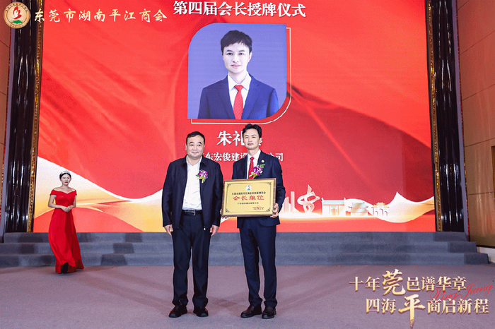 就职仪式上,刘正仁等领导为东莞市湖南平江商会第四届会长朱礼基、监事长李光辉授牌。